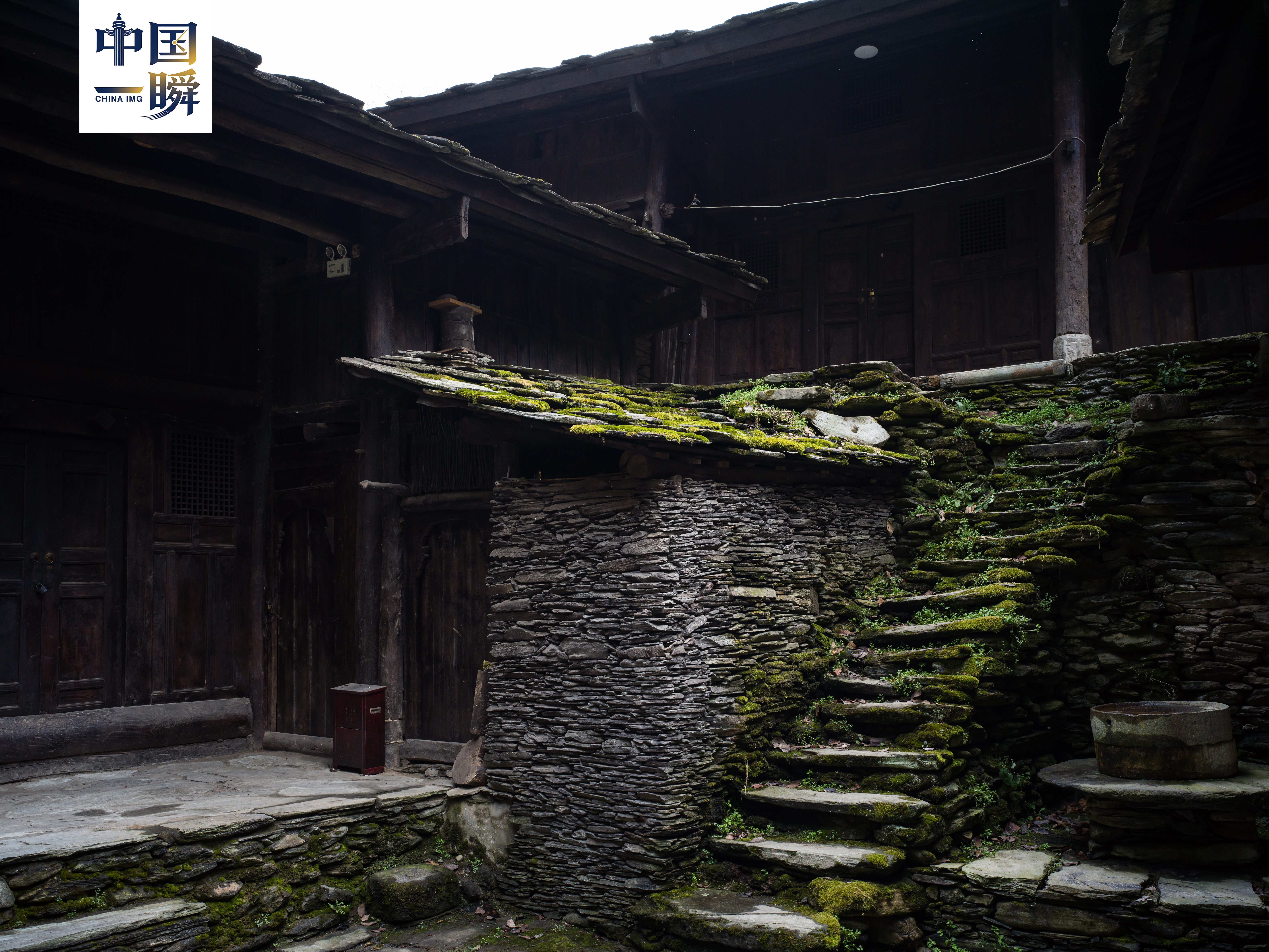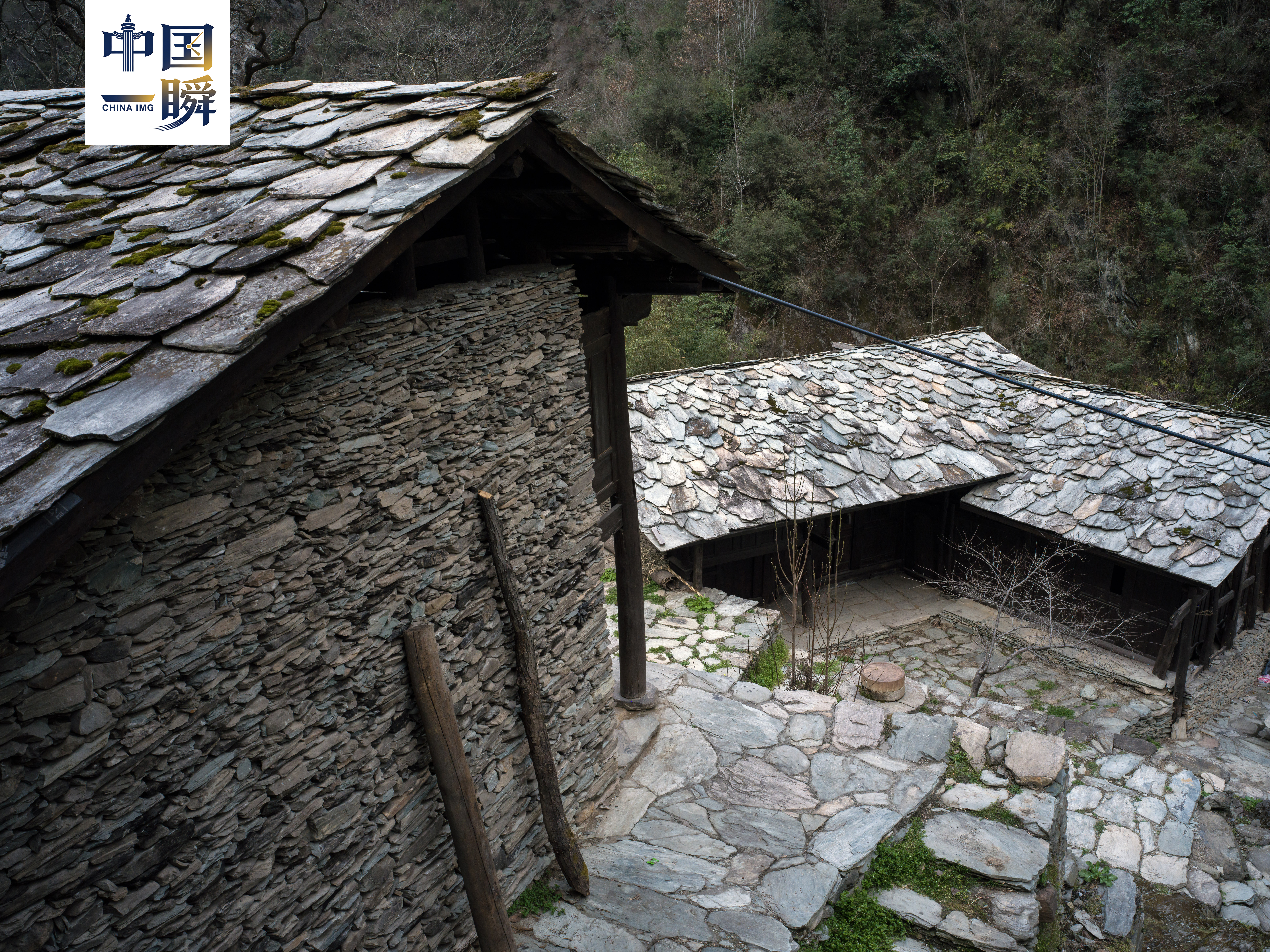 在青山环抱中的甘肃文县玉垒坪乡巴巴沟明代石板房依山就势、鳞次栉比,石墙、石阶、石磨构成完整石头村落景观,云雾漫山腰,尽显古朴静谧。